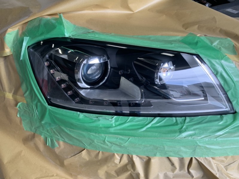 パサートは以前に左ヘッドライトを新品に交換したことがあり、左右で比較すると右側のヘッドライトが黄ばんで表面のハードコートが劣化して割れていました。