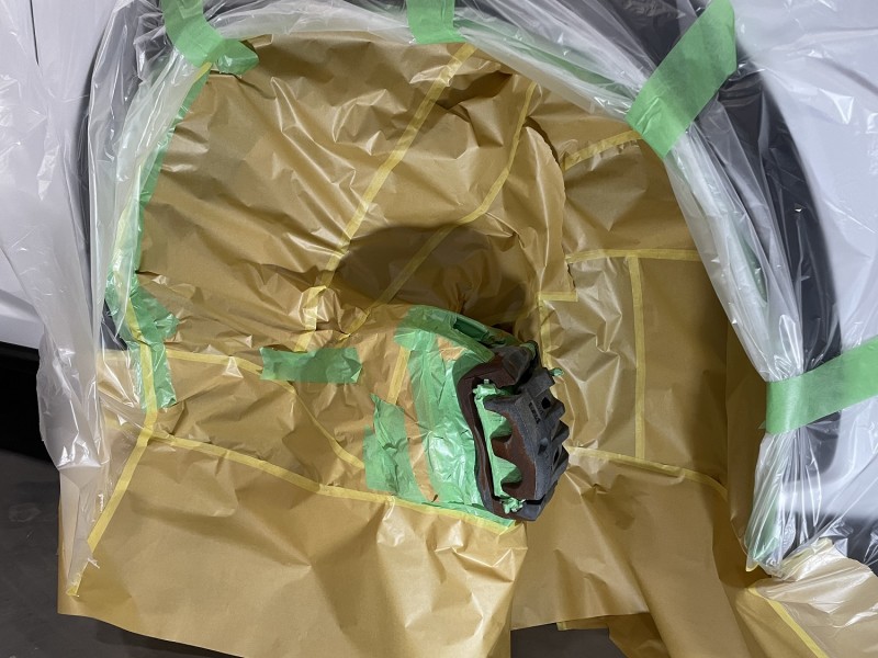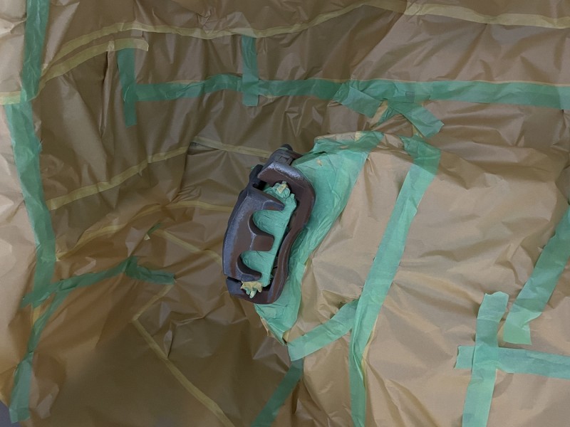 一番はブレーキパットとかいろいろ外して単体でできれば早いのですが、ブレーキのエア抜きが診断機を使用しないとできないため、実装状態で塗装します。