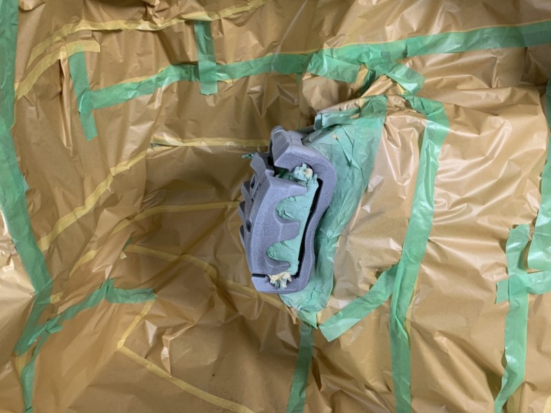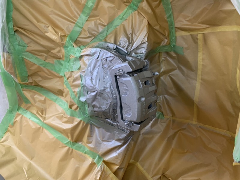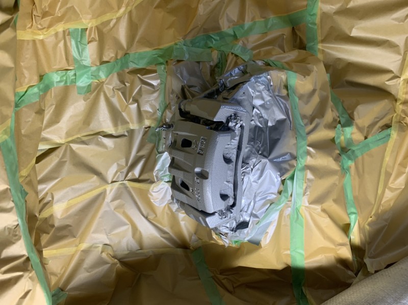 今日は昨日養生したレクサス NX フロントブレーキキャリパーのサビ除去&下地処理、塗装をしました。