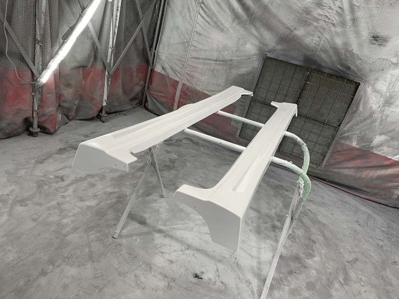 とりあえずのサフェーサー処理なので、フロントエアロバンパー、サイドステップ共に研いでみて歪みを見ながら再補修していきます。(^^)/
