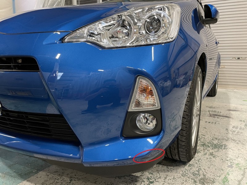 トヨタ アクア フロントバンパー補修にて入庫、バイク カウル補修にて入庫