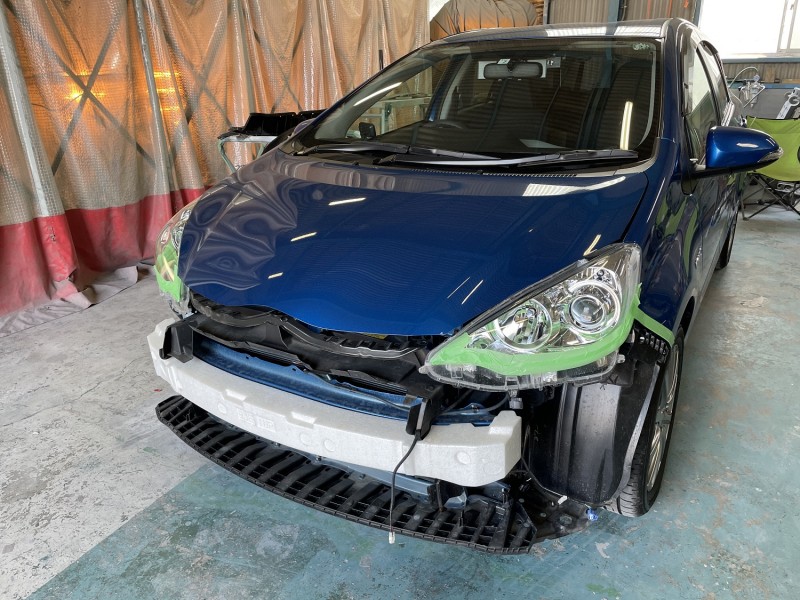 トヨタ アクア フロントバンパー板金、バイク カウル 塗装