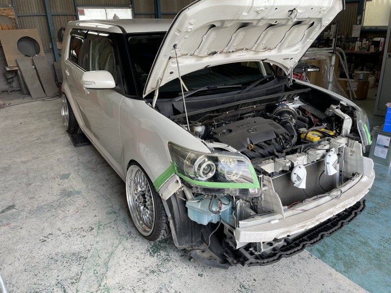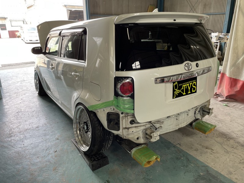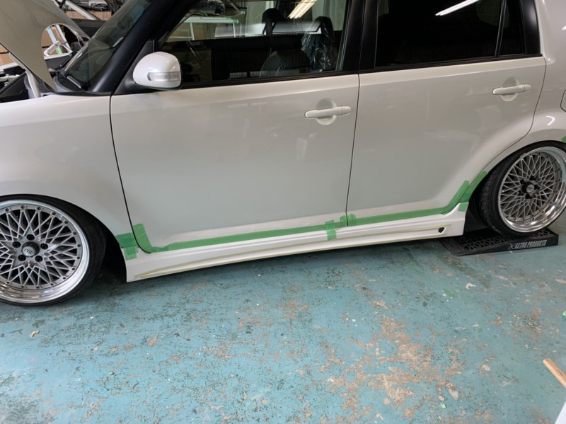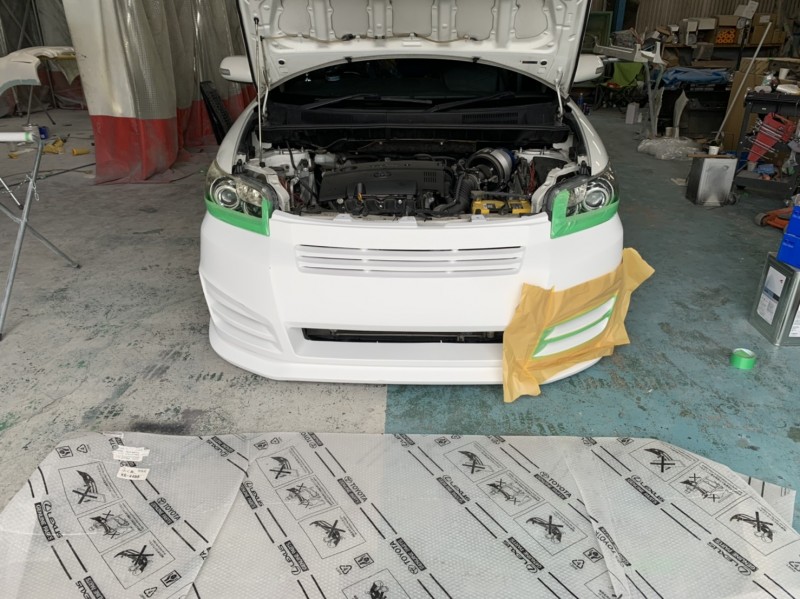 トヨタ ルミオンのフロントエアロバンパー・サイドステップ・リヤエアロバンパーの下処理、塗装、交換に着手しました。