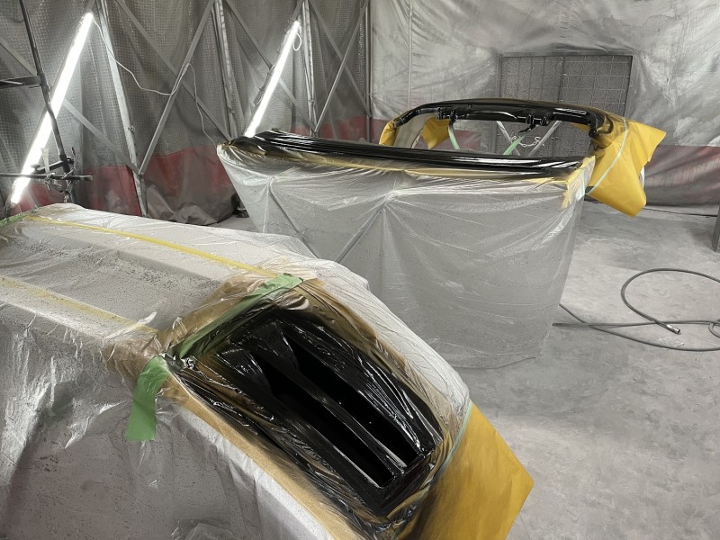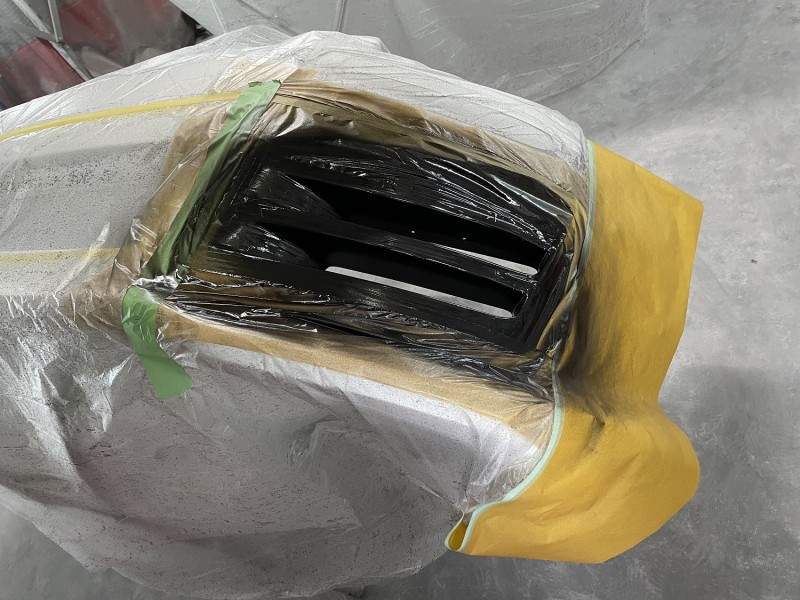 オーナー様より車体同色のホワイトパールとブラックの2色で塗り分けにしたいということだったのでまずブラックの塗り分け部から塗装しました。