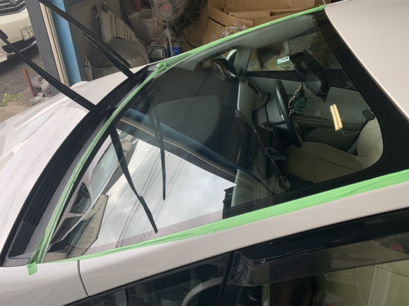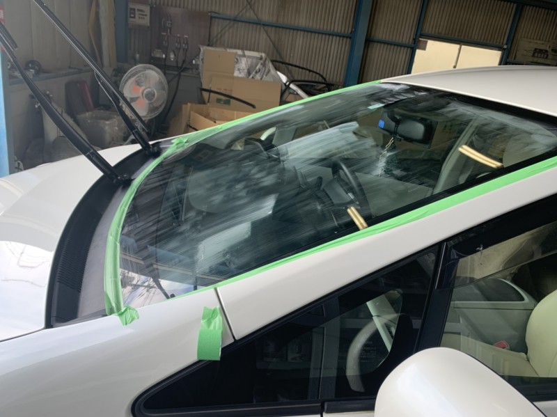 トヨタ プリウスα フロントガラス 油膜除去&撥水コーティング 施工中