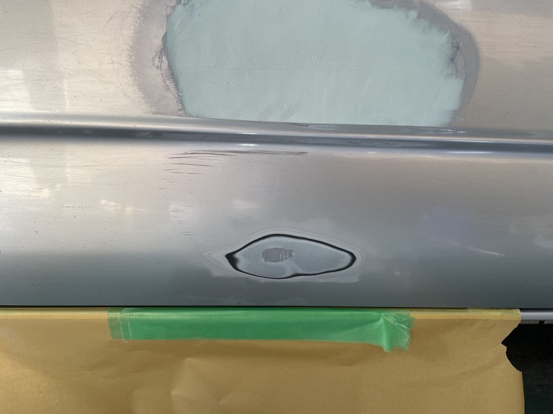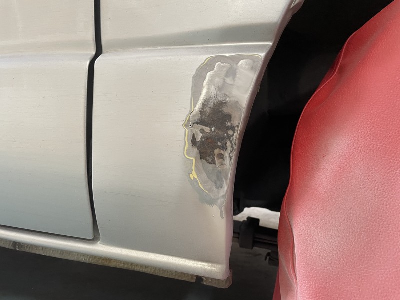 以前に他の板金屋さんで直しているらしく、修理したところがサビ浮きしてきたということで、削ってみたらパテとサビが出てきました。