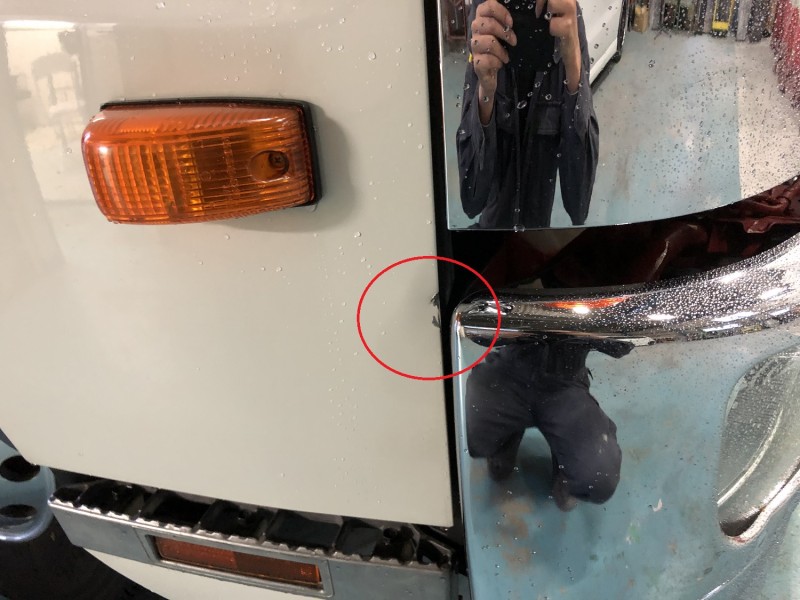 こんばんは、TYSのYです。修理予定だったトラックが入庫されました。右ドア板金補修塗装、フロントバンパー交換、右ヘッドライト交換、右ヘッドライトステー交換をしていきます。右ドア キズ、ヘコミフロント...
