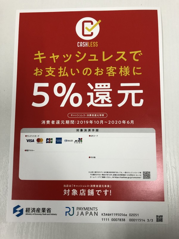 キャッシュレス消費者還元制度導入のお知らせ